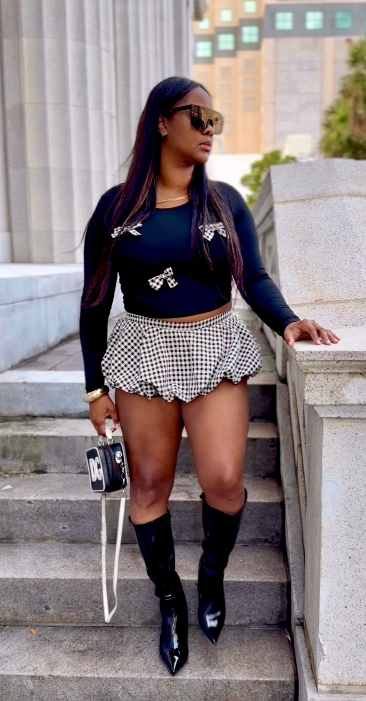 This plaid mini skirt adds a touch of youthful exuberance, while the connected panties ensured a comfortable and secure fit. The long sleeve black top, adorned with matching plaid bows, provided a chic contrast, elegantly tying the ensemble together.